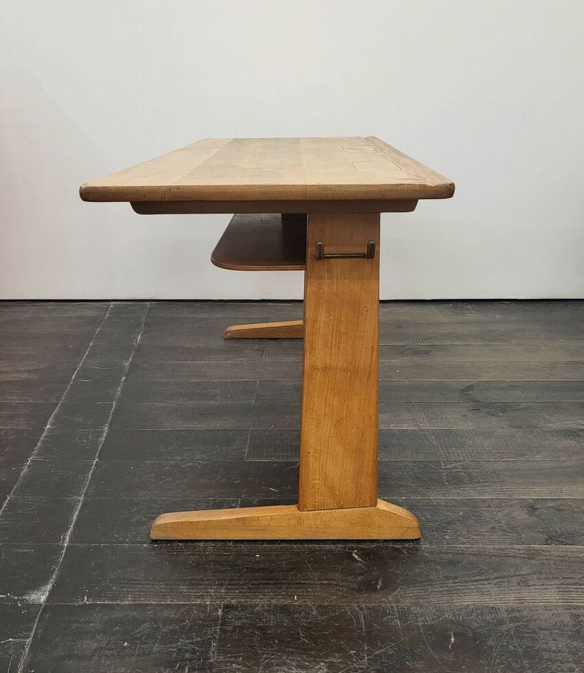 Bureau d'enfant en hêtre doré, robuste et comfortable. Il est légèrement patiné par le temps. Sa forme des années 70 lui donne un aspect vintage très sympathique.