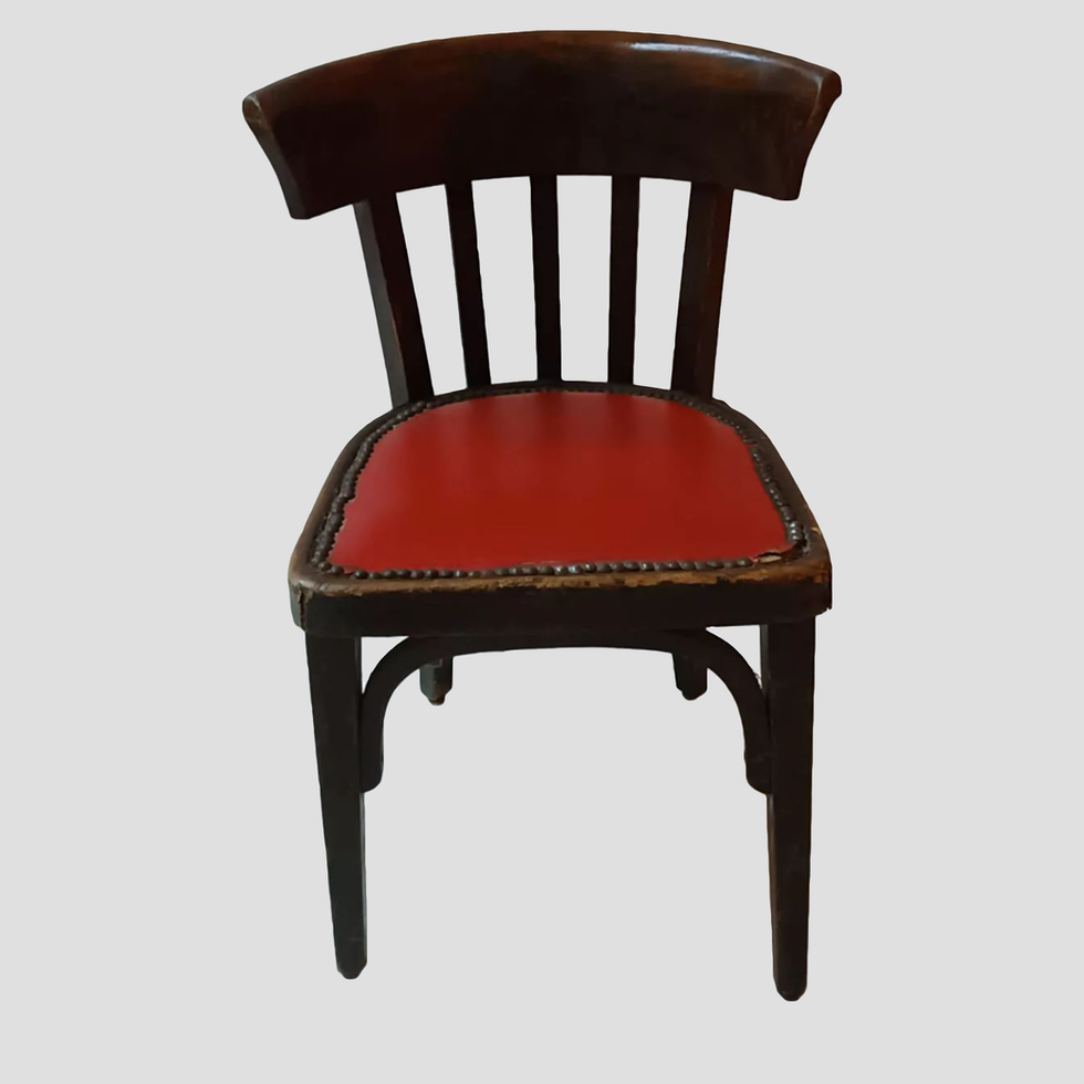 La chaise baumann, modèle n°108 possède un dossier ajouré à quatre lattes verticales surmontées d'un bandeau cintré. L'assise ovoïde est remplie d'un contre-plaqué puis recouverte d'un cuir rouge clouter. Ce classique des modèles de bistrot fut produit dès les années 1930. Le modèle des années 30 possède des pieds de section ronde. Parfois, on trouve également trois lattes verticales. Absence de photo du marquage.