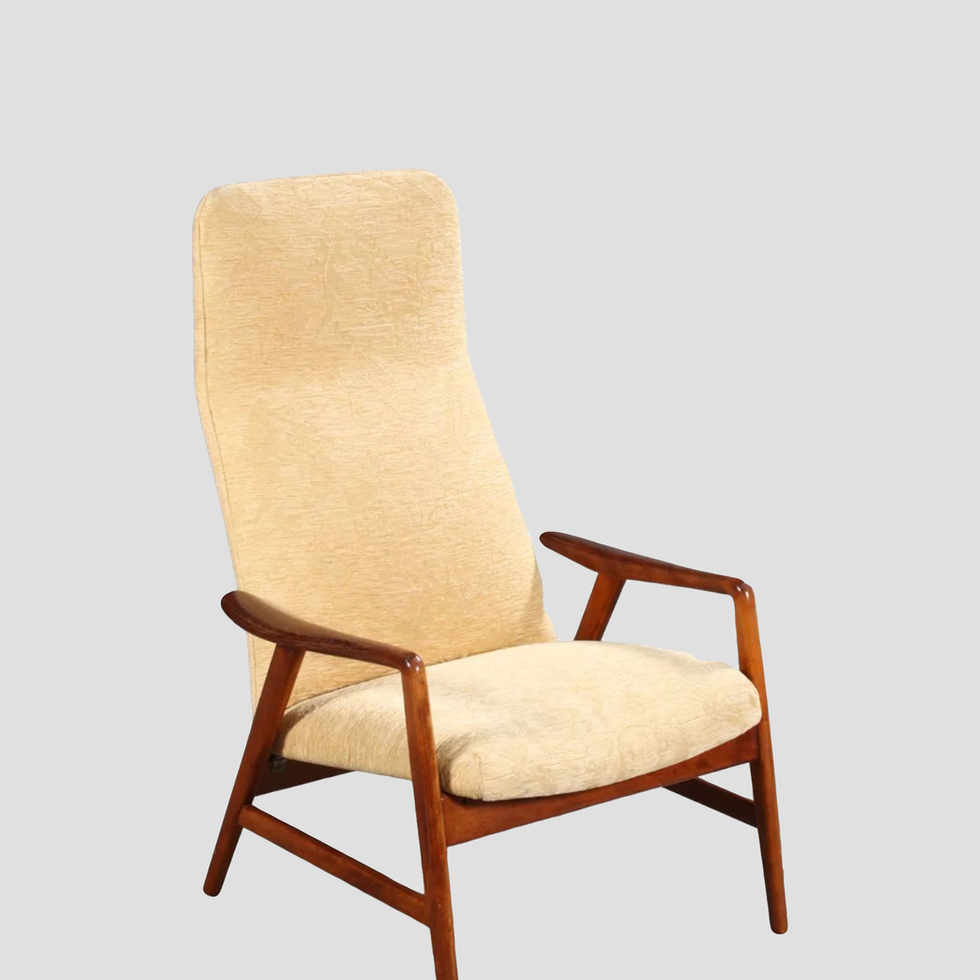 Alf svensson. Fauteuil kontur avec structure en bois d'orme massif laqué, coussin d'assise et de dossier recouverts de velours à motifs de couleur crème, position assise réglable. Conçu en 1957. Fabriqué par fritz hansen, modèle kontur, marqué. Présente de légères traces d'utilisation.