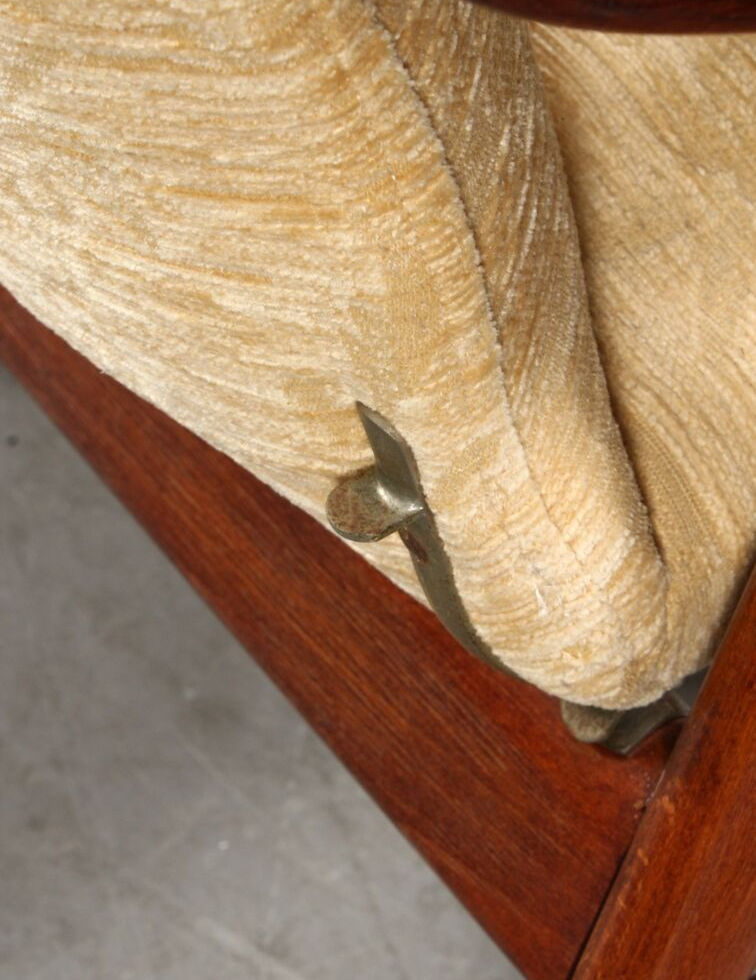 Alf svensson. Fauteuil avec structure en bois d'orme massif laqué, coussin d'assise et de dossier recouverts de velours à motifs de couleur crème, position assise réglable. Conçu en 1957. Fabriqué par fritz hansen, modèle kontur, marqué d'ici. Sh. 38cm. Présente de légères traces d'utilisation en plus de quelques marques sur le couvercle, raccords en laiton légèrement ternis. (absence de photo du marquage ).