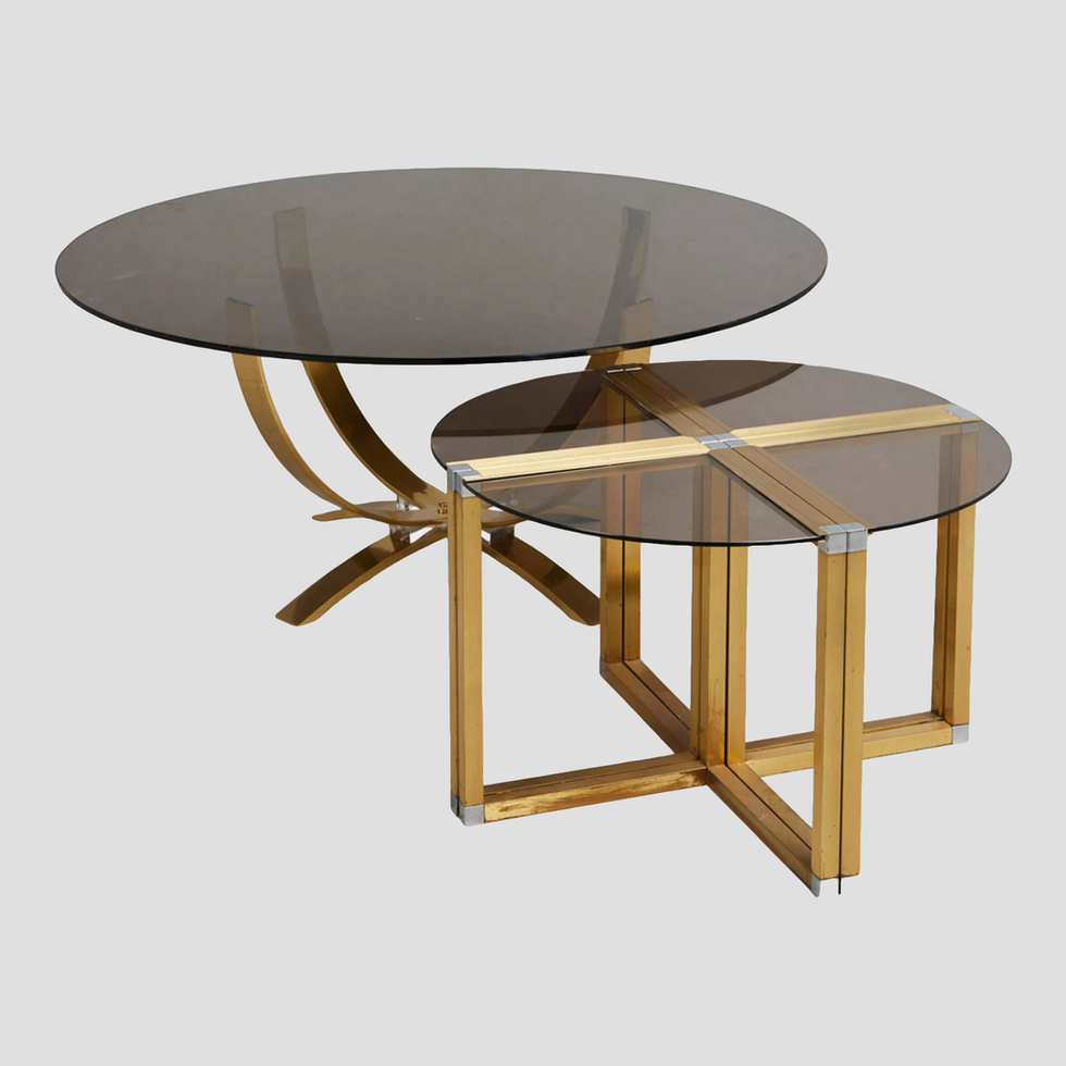 Table basse dans son jus avec quatre tables d'appoint, années 1970, france. Ensemble de tables gigognes composé de cinq parties, construction de table avec une base à quatre branches en laiton et des éléments rectangulaires en verre acrylique et un plateau de table rond et lâche en verre fumé ainsi que quatre tables d'appoint, chacune avec un pied à trois pieds, structure à entretoises en laiton et métal chromé et plateau de table en quart de cercle en verre fumé, les tables d'appoint peuvent soit être poussées à ras sous la grande table, soit rapprochées pour former une deuxième table avec un plateau de table vers le bas, grande table: h.52cm, d.120cm, tables individuelles: h.46cm, d.70cm.